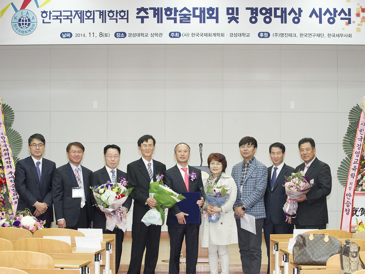 안녕하십니까? 지난 11월 8일(토) 경성대학교에서 열린 2014년 한국국제회계학회 추계학술대회 및 경영대상 시상식이 성황리에 개최되었습니다. 이번 학회는 170명이 넘는 회원님들이 참석하셔서 45의 논문을 발표해 주셨습니다. 바쁘신 와중에도 먼 길을 마다하지 않으시고 참석해 주신 회원분들과 멀리서 관심 가져주신 모든 분들께 감사드립니다. 앞으로도 학회발전을 위해 많은 관심 부탁드립니다.