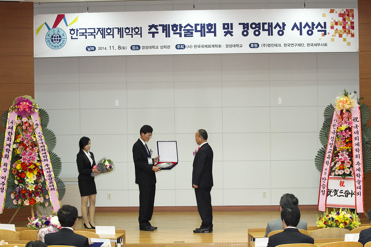 안녕하십니까? 지난 11월 8일(토) 경성대학교에서 열린 2014년 한국국제회계학회 추계학술대회 및 경영대상 시상식이 성황리에 개최되었습니다. 이번 학회는 170명이 넘는 회원님들이 참석하셔서 45의 논문을 발표해 주셨습니다. 바쁘신 와중에도 먼 길을 마다하지 않으시고 참석해 주신 회원분들과 멀리서 관심 가져주신 모든 분들께 감사드립니다. 앞으로도 학회발전을 위해 많은 관심 부탁드립니다.