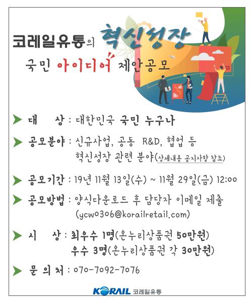 한국유통경영학회와 업무협약체결을 맺은 (주)코레일 유통이 '코레일유통의 혁신성장, 국민 아이디어 제안 공모'를 다음과 같이 공모하여 안내드립니다.