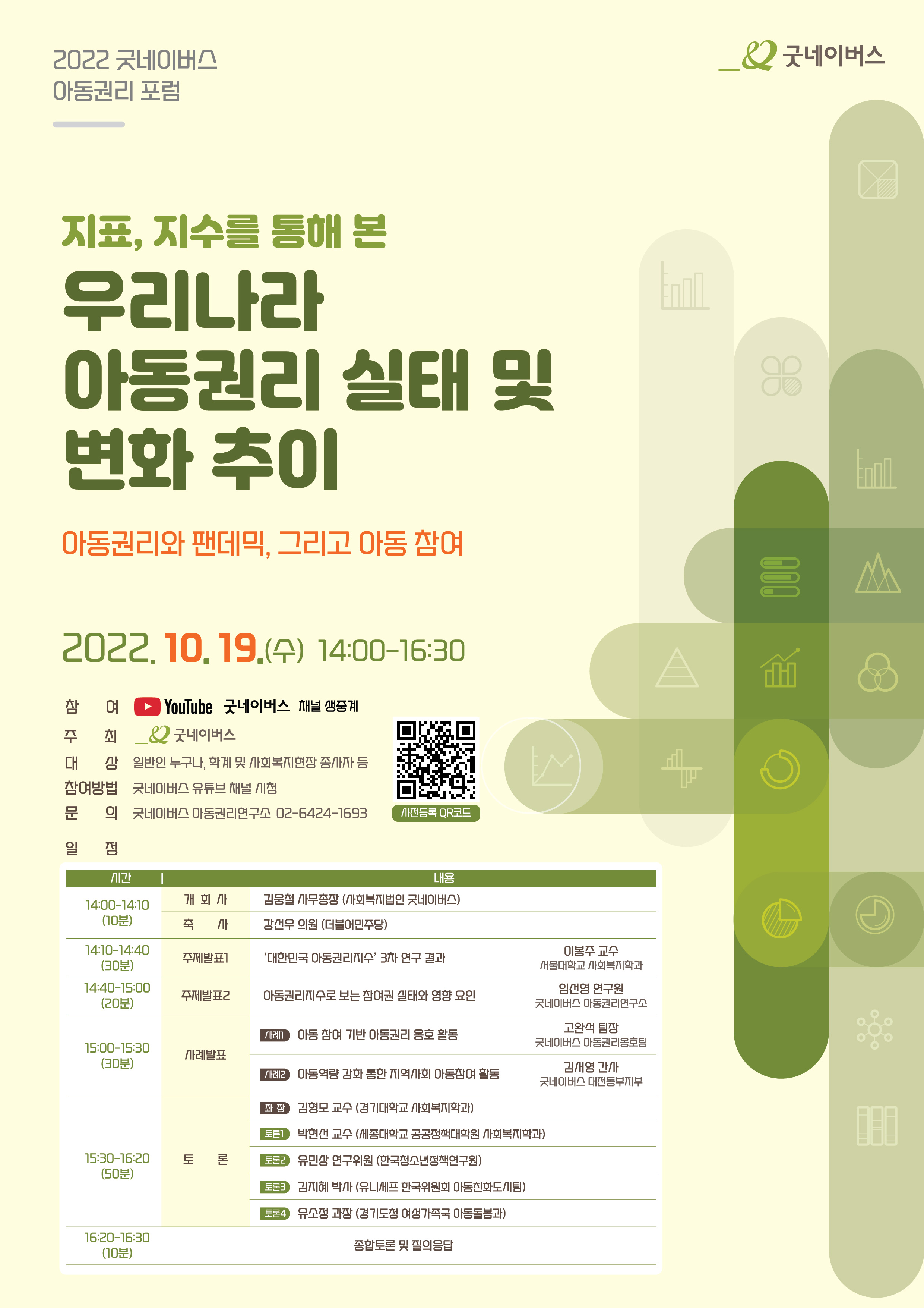 주 제 : 지표, 지수를 통해 본 우리나라 아동권리 실태 및 변화 추이 - 아동권리와 팬데믹, 그리고 아동 참여 일 시 : 2022년 10월 19일(수요일) 14:00~16:30 진 행 : 굿네이버스 유튜브 채널 생중계 1) 사전 등록 : https://forms.gle/kAKQoSzCcXjSCxso7 2) 참가 링크 : https://www.youtube.com/user/GoodNeighborskr 3) 기 타 - 사전 등록 시 행사 당일 오전에 포럼 자료집을 응답한 이메일로 발송 예정 - 사전 등록 없이도 상단 링크 또는 포스터 QR코드 통해서 유튜브 실시간 시청 가능 문 의 : 굿네이버스 아동권리연구소 임수지 간사(02-6424-1693) |