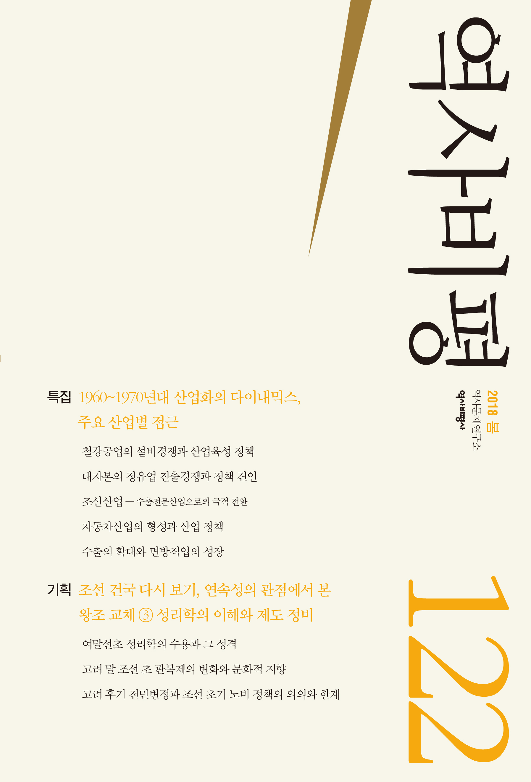 「역사비평」 2018년 봄호. 봄호 특집은 1960년대와 1970년대 산업화 정책이다. 이번 특집에서는 경제성장 과정에서 가장 중요한 산업 분야였으며 현재 한국 경제에서도 중요한 역할을 하고 있는 철강, 정유, 조선, 자동차, 그리고 면방직업 등 각각의 산업 분야를 분석의 대상으로 삼았다.