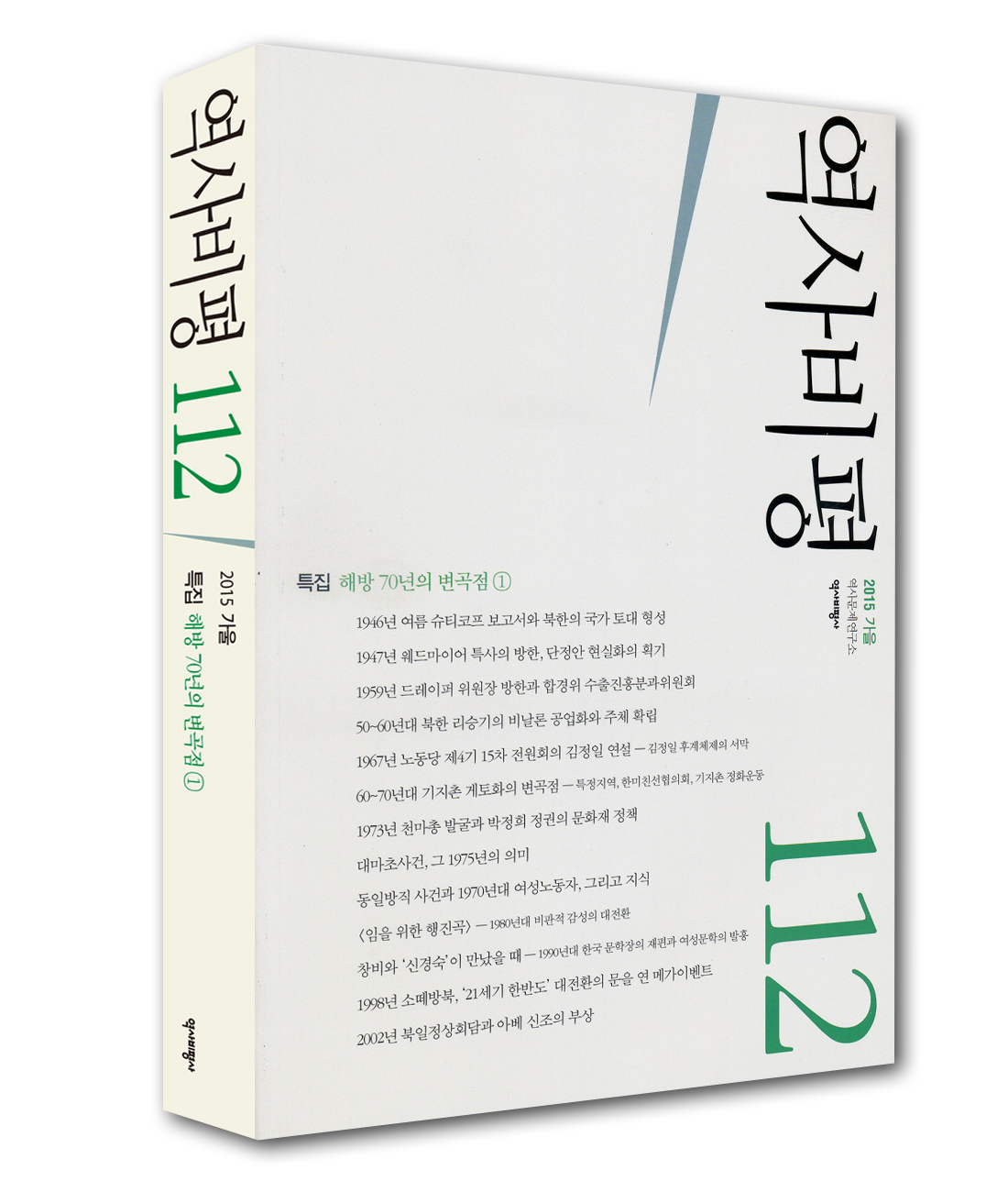 「역사비평」 2015년 가을호. 해방 70주년 기념호로 발간되는 이번 「역사비평」에서 새로 구성된 편집위원회는 새로운 시도를 해보았다. 특집으로 구성된 '해방 70년의 변곡점'은 그동안 한국 현대사 연구에서 때때로 언급은 되었지만, 독자적으로는 조명 받지 못했던 주제들을 찾고자 했다.