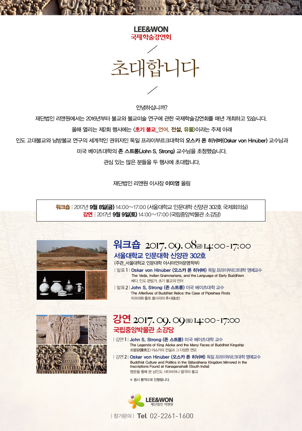 이번 워크숍은 인도 고대불교와 남방불교 연구의 세계적인 권위자인 독일 프라이부르크대학의 오스카 폰 히뉘버(Oskar von Hin?ber) 교수님과 미국 베이츠대학의 존 스트롱(John Strong) 교수님을 초청했습니다.