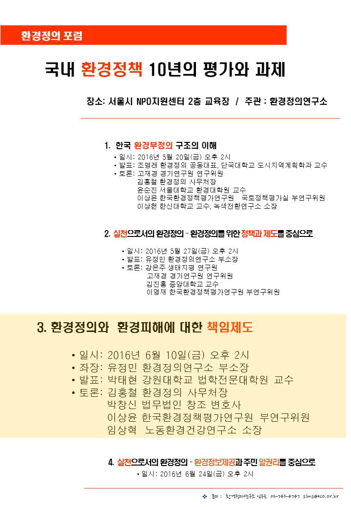 환경피해에 대하여 정부와 기업의 책임을 묻고  환경정의를 실현하기 위하여 바람직한 대안을 모색하고자 하는 자리에  많은 관심과 참여 바랍니다.