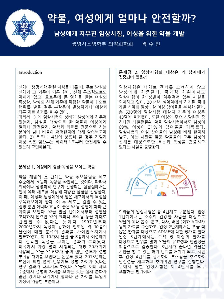 약물, 여성에게 얼마나 안전할까라는 주제로 남성에게 치우친 임상시험, 여성을 위한 약물 개발에 관한 연구를 수행한다.