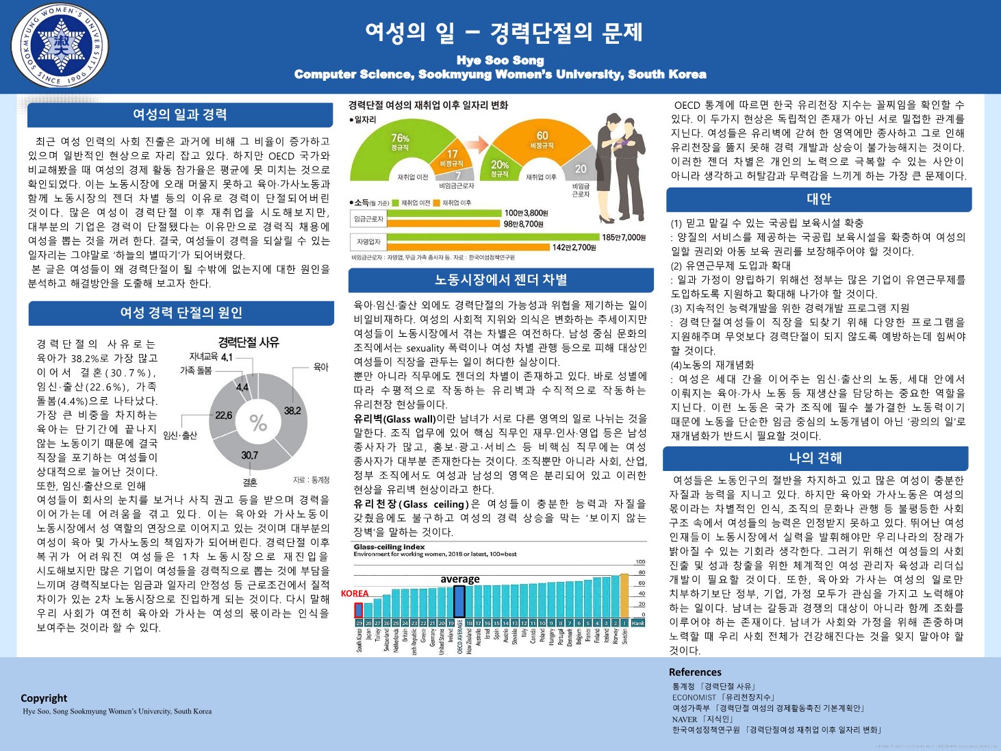 여성의 사회진출은 증가하고 있지만, 여전이 우리 나라의 여성 경제활동 참가율은 평균이하인 점에서 문제점을 인식하고, 여성경력 단절의 원인을 노동시장에서의 젠더차별에서 분석한다. 여성경력 단절의 문제를 해결책으로 보육시설의 확충, 유연근무제 확대, 여성경력 프로그램지원, 노동의 재개념화를 제시한다.