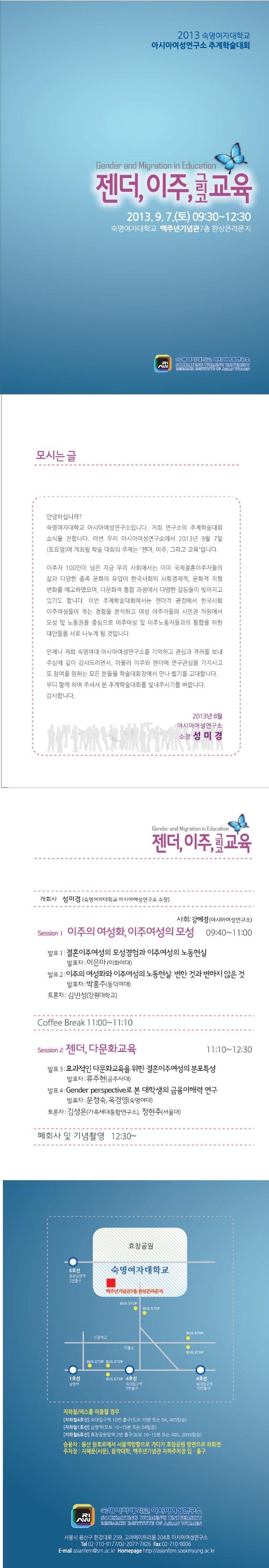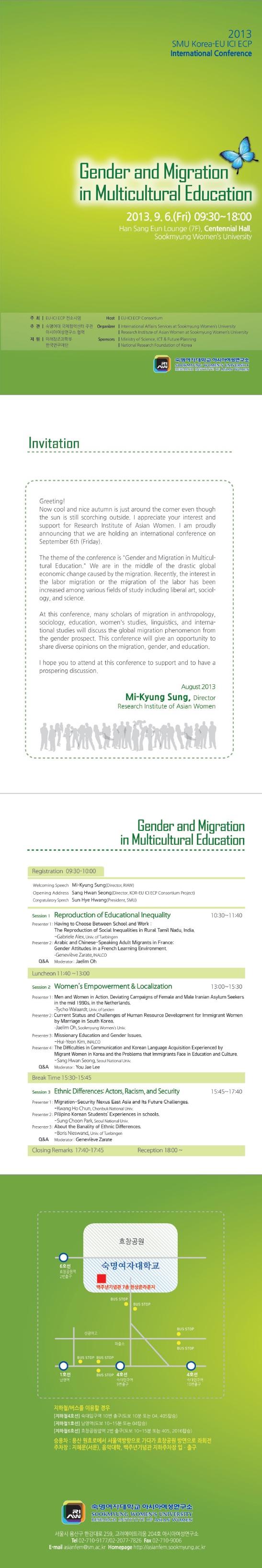 본 연구소에서는 9월 5일 금요일과 9월 6일 토요일 양일 간 국제학술대회 및 추계학술대회를 개최하게 되었습니다. 이번 국제학술대회는 2011년부터 3년 간 서울대와 전북대 그리고 우리대학이 공동으로 수행하고 있는 미래창조과학부(구 교육과학기술부) 지원과제의 일환으로 개최하게 되었습니다. 해당 과제는 EU와 역외국가 (한국, 일본, 호주, 뉴질랜드 등)의 고등교육기관 간 균형 잡힌 파트너십을 향상시키려는 목적으로 진행되었고 이번 학술대회에서는 프랑스(INALCO), 독일(Tuebingen University), 네덜란드(Leiden University)의 저명 학자들과 국내 참여 대학에서 초청된 연사들이 “Migration, Gender and Education''을 주제로 발표할 예정입니다. 2일차 진행될 추계학술대회에서도 ‘젠더, 이주 그리고 교육’을 주제로 여성이민자의 관점에서 훌륭한 연구를 수행해 오신 연사들의 발표가 이루어질 예정입니다.