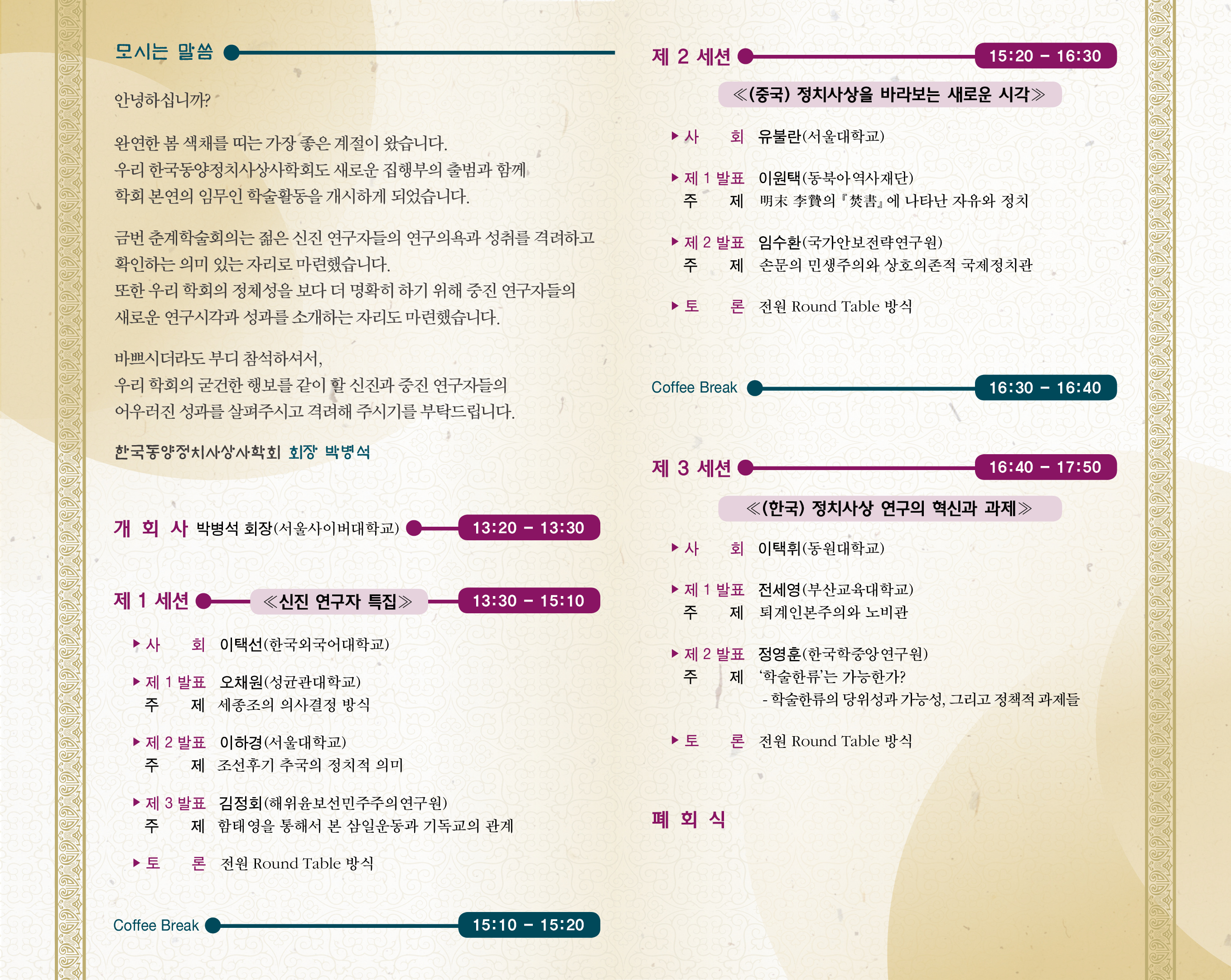 신진과 중진 연구자들의 어우러진 성과를 살펴주시고 격려해 주시기를 부탁드립니다.