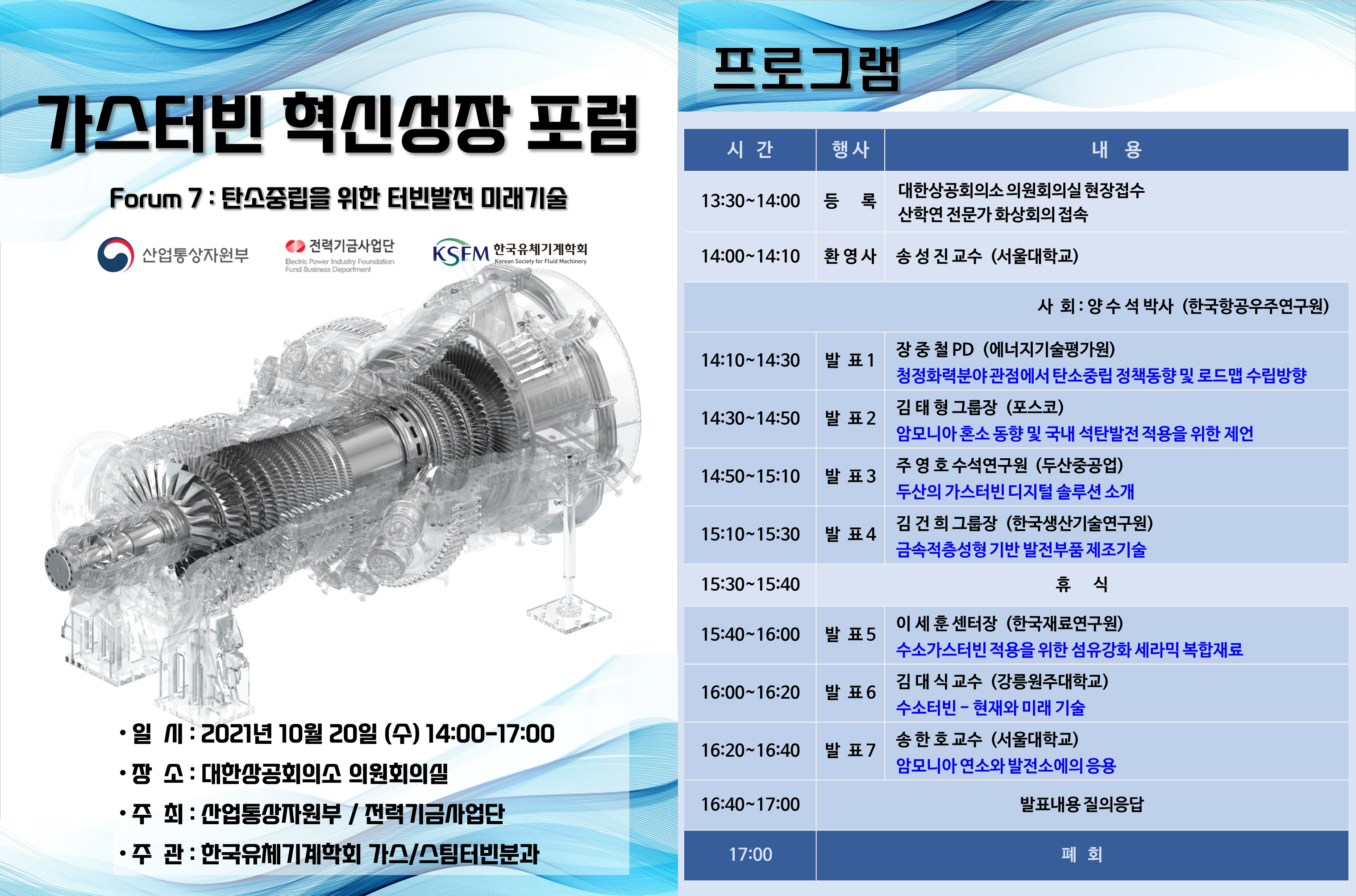 해당 사업의 일환으로 일곱 번째 행사인 ‘탄소중립을 위한 터빈발전 미래기술’ 포럼이 아래와 같이 진행 예정입니다.