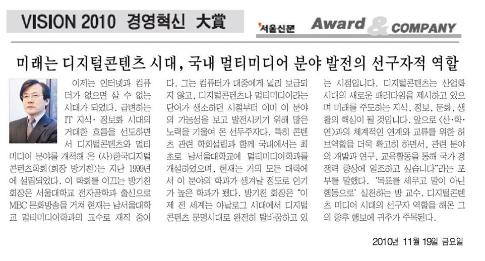 서울신문 VISION 2010 경영혁신 대상을 수상하였습니다.