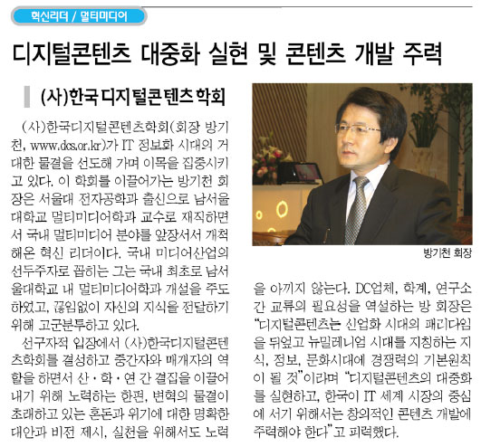 안녕하세요? 관리자 입니다. (사)한국디지털콘텐츠 학회가 혁신리더로 선정되어 스포츠서울 11월 5일자에 게재되었습니다. 첨부화일에 전체전문과 기사가 스캔되어 있습니다. 감사합니다.