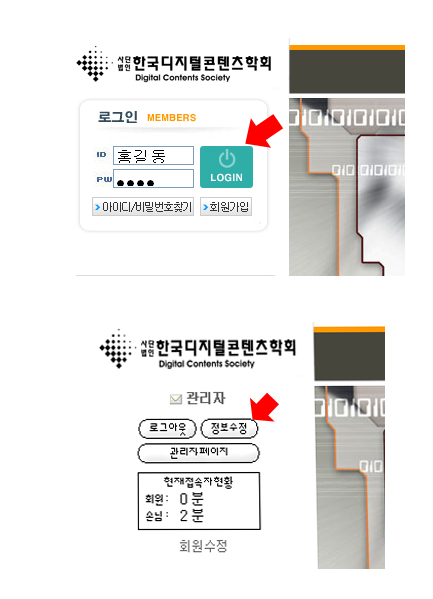 회원정보 수정 안내입니다. ID 와 패스워드의 변경시에 상단의 그림처럼 아래와 같이 이용하여 주십시요 1. DCS 홈피의 왼쪽 상단에서 로그인 하십시요 2. 로그인후 접속자의 이름이 보이며 하단에 정보수정 버튼이 보입니다 3. 정보수정을 누르면 개인정보 변경 창이 열립니다. 개인의 정보사항을 변경하신 후 하단의 '수정완료' 버튼을 눌러주십시요 감사합니다.