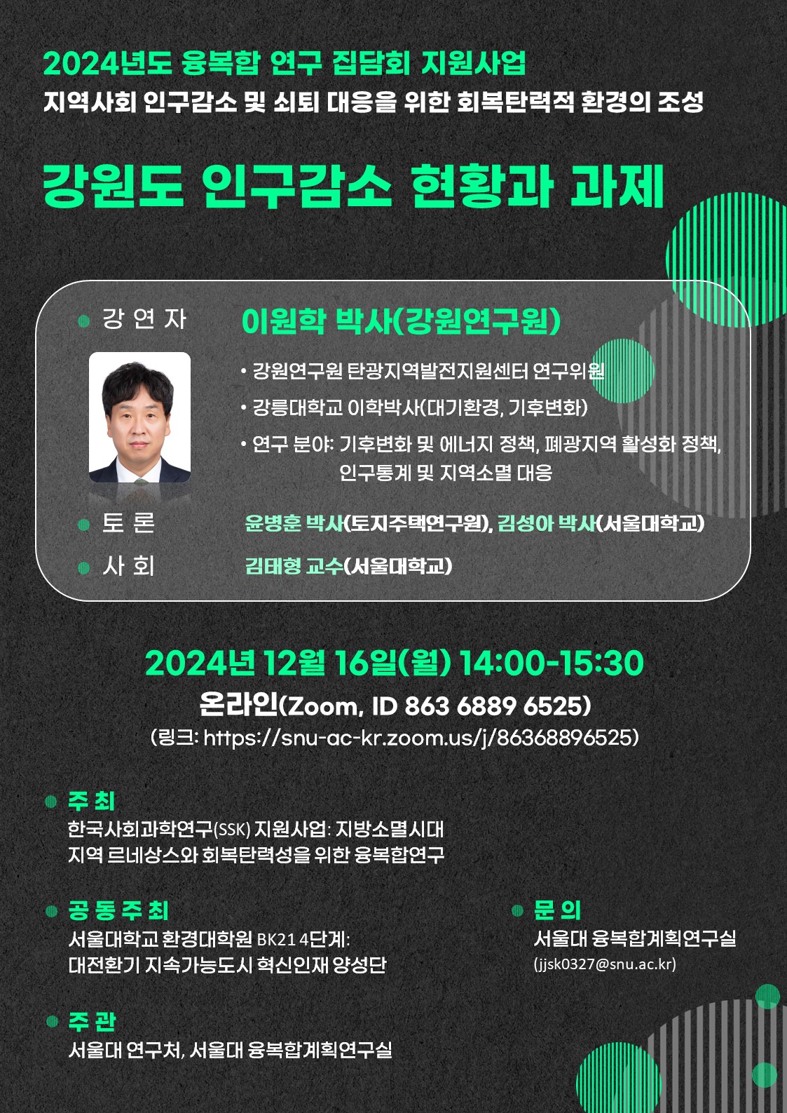 (본 집담회는 한국사회과학연구(SSK) 지원사업지방소멸시대 지역 르네상스와 회복탄력성을 위한 융복합연구와 서울대학교 환경대학원 BK21 4단계대전환기 지속가능도시 혁신인재 양성단에서 공동 주최하며서울대 연구처와 서울대 융복합계획연구실의 주관으로 진행됩니다)