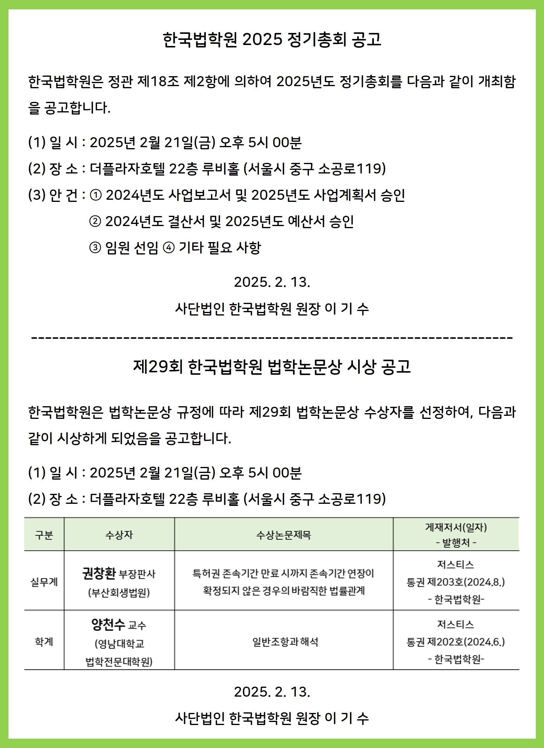 2025년도 정기총회 및 제29회 법학논문상 시상식 개최