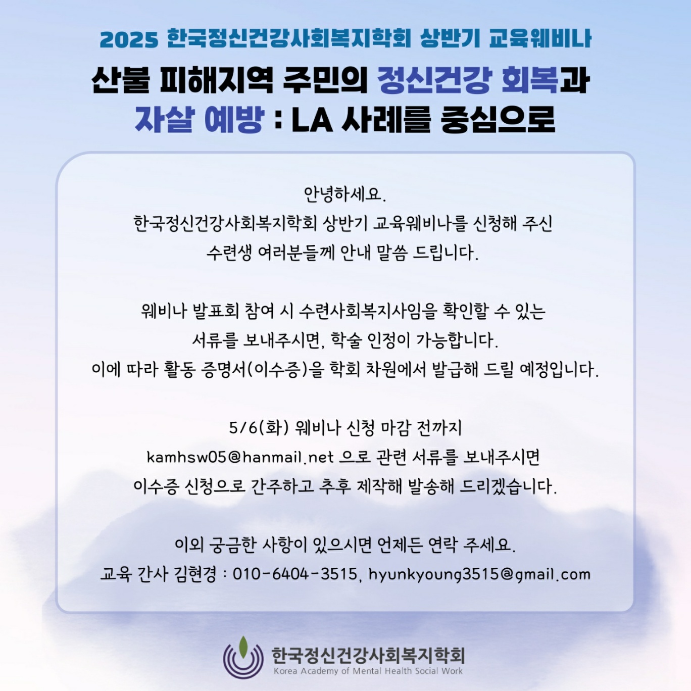 [한국정신건강사회복지학회] 산불 피해지역 주민의 정신건강 회복과 자살 예방: LA사례를 중심으로 상반기 교육웨비나