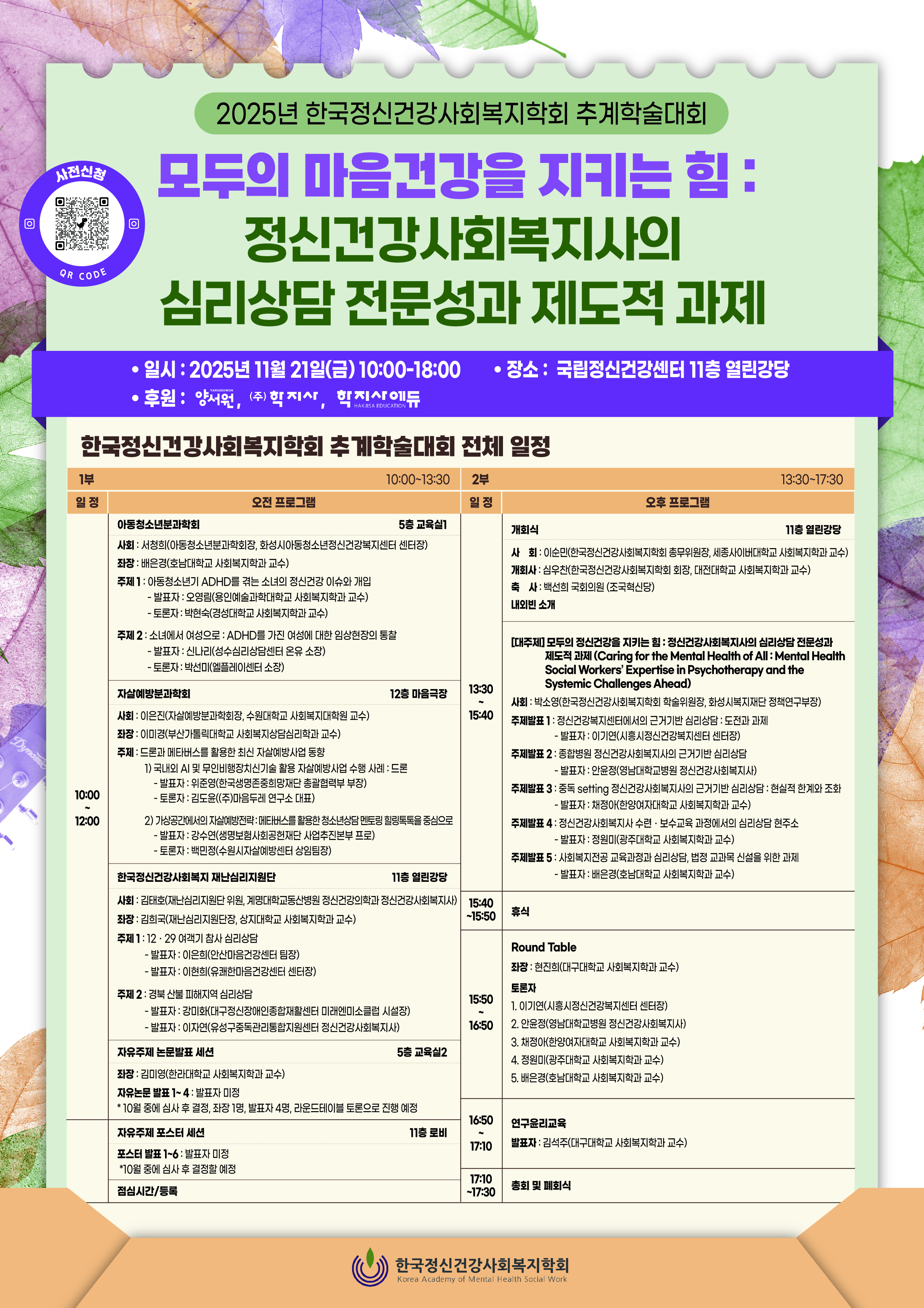 [한국정신건강사회복지학회] 2025년 한국정신건강사회복지학회 추계학술대회 사전신청 및 참석 요청 건