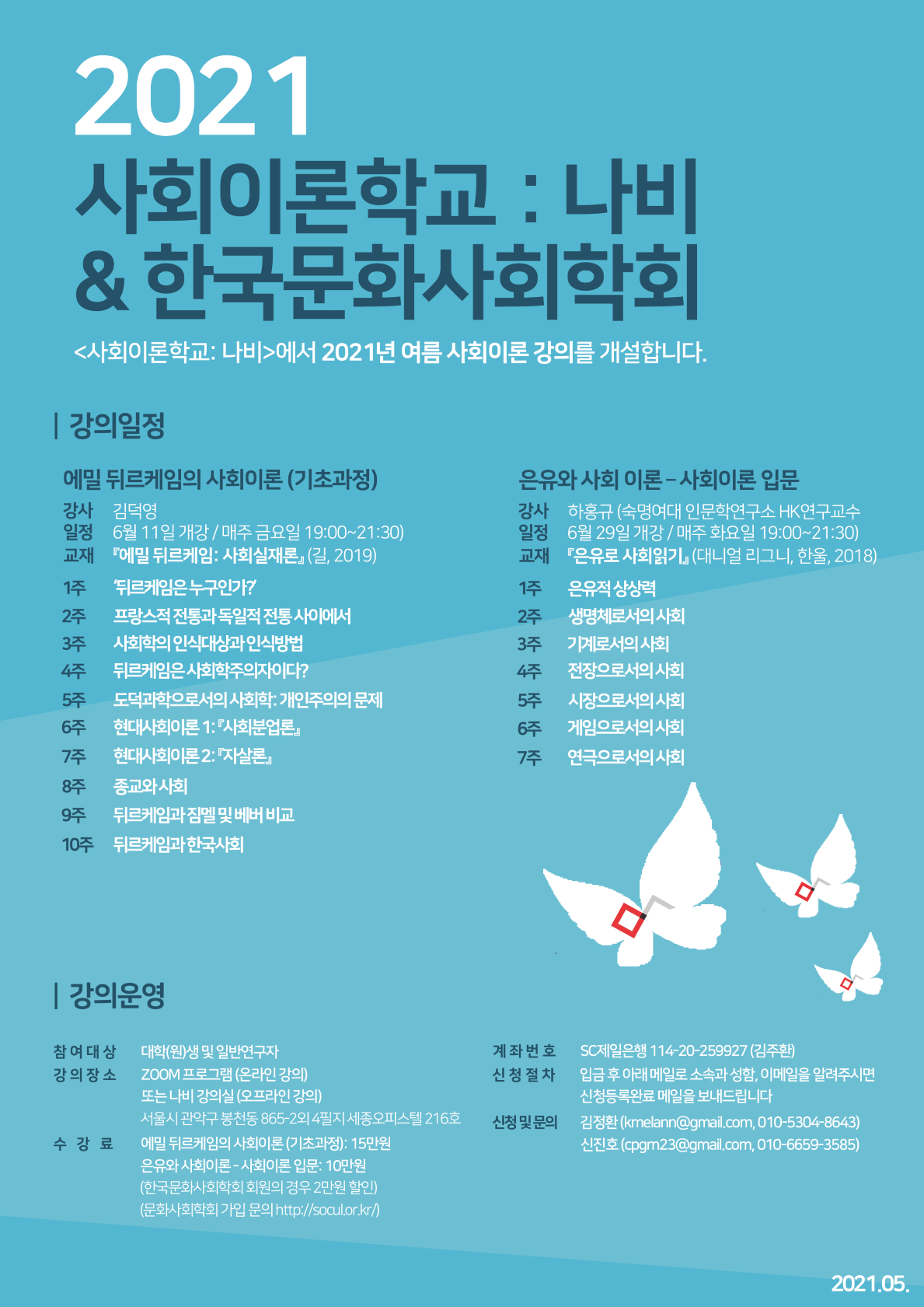 이번 강좌 역시 <사회이론학교: 나비>와의 공동기획 프로그램입니다. 한국문화사회학회는 문화사회학 분야를 포함한 사회학 이론을 전공하는 기성 연구자 및 학문 후속세대, 나아가 일반 시민들에게까지 학술적 소통 영역을 확대해가고자 하는 일환으로 <사회이론학교 나비>와 해당 강좌를 공동 운영하고 있습니다.
