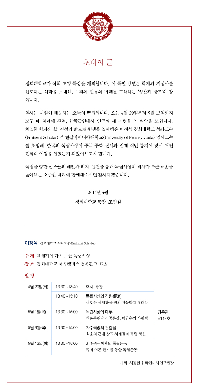 경희대학교는 개교 65주년을 기념해 경희대학교 석좌교수(Eminent Scholar)겸 펜실베이니대학교 명예교수인 이정식 교수를 모시고 석학초청특강을 개최합니다.