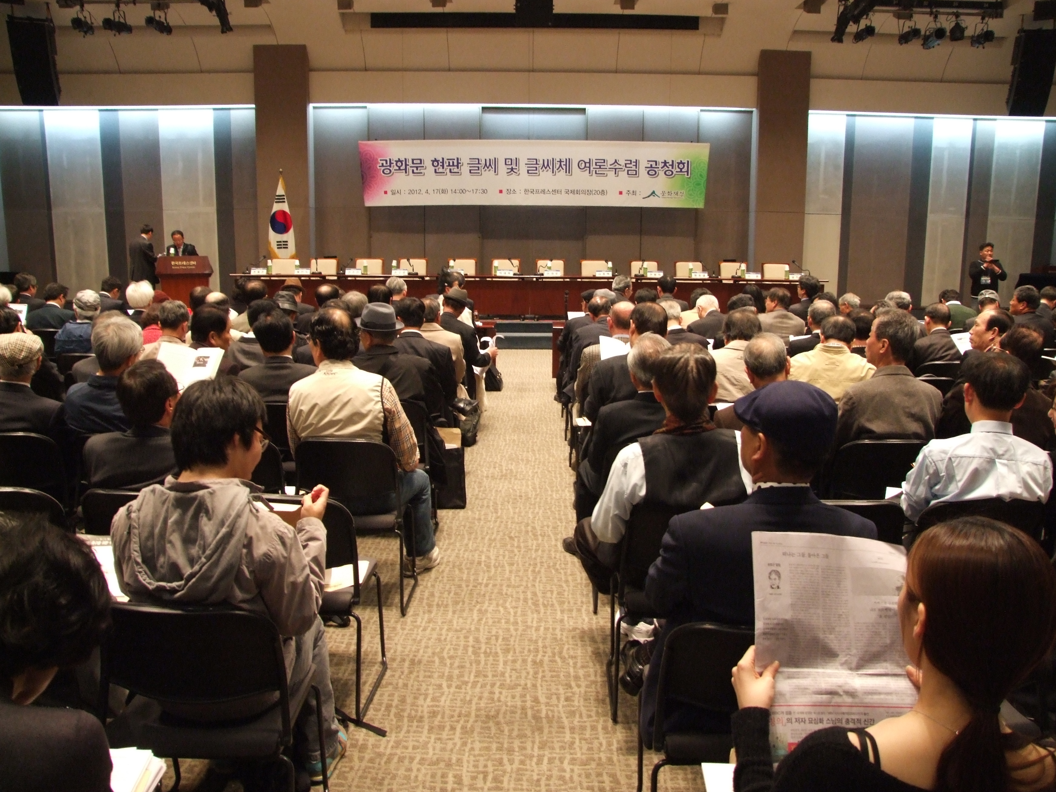 2012년 4월 17일(화) 오후 2시부터 문화재청 주관으로 한국프레스센터 국제회의장에서 열린 '광화문 현판 글씨 및 글씨체 여론 수렴 공청회' 자리에 참석한 청중들과 공청회장의 모습.