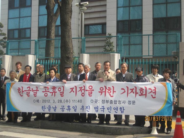 2012년 3월 28일(수) 오전 11시에 한글회관 강당에서 '한글날 공휴일 추진 범국민연합 출범식'을 마치고 정부종합청사 후문 앞에서 오전 11시 40분부터 진행된 '한글날 공휴일 지정을 위한 기자회견' 모습.