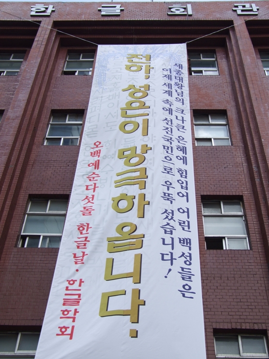 565돌 한글날을 기리어 한글회관에 건 펼침막. 이 펼침막은 2011년 9월 15일부터 한 달여 동안 걸어 놓을 예정이다.