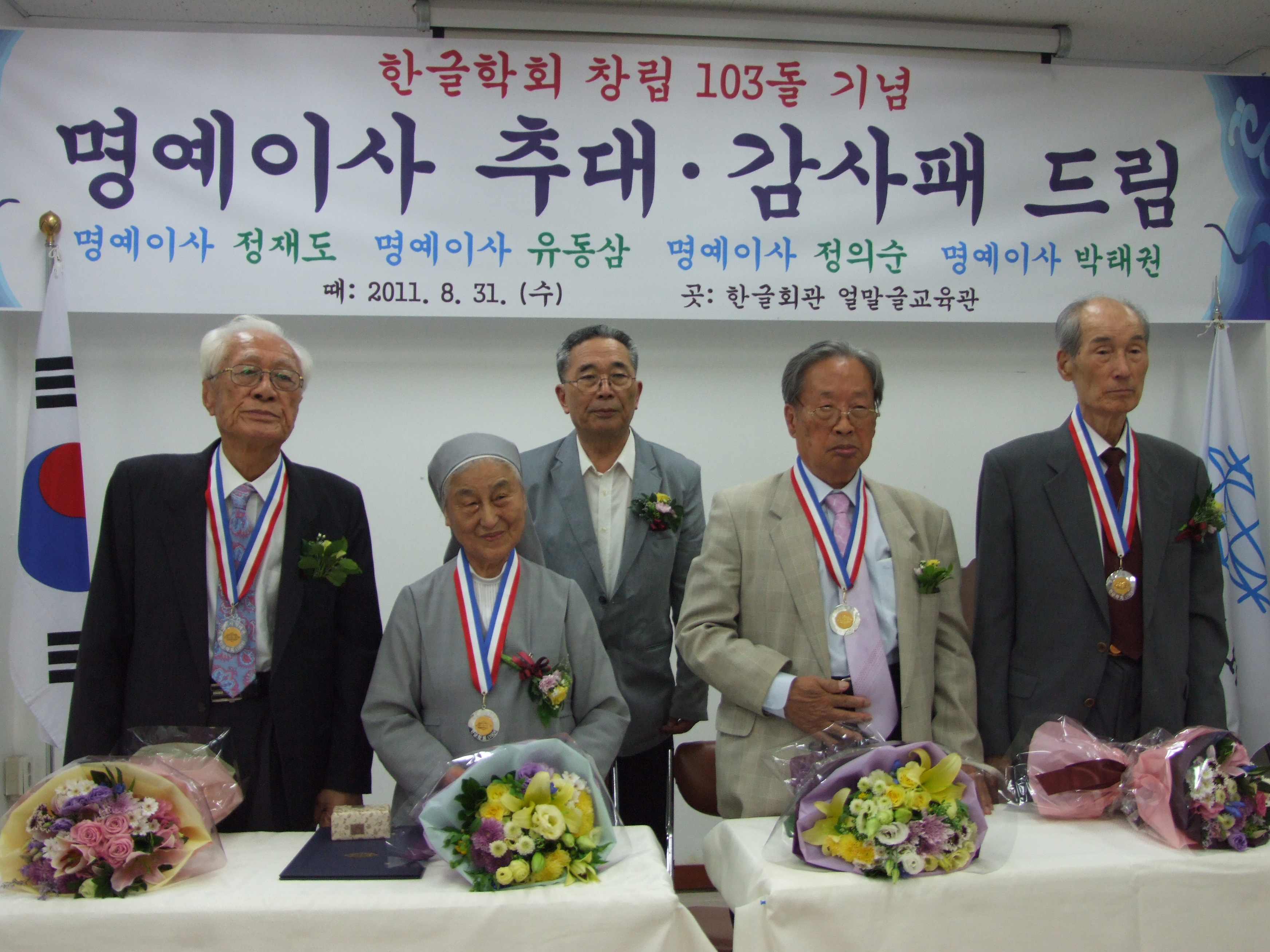 ▲ 2011년 8월 31일 오후 4시부터 있었던 한글학회 창립 103돌 기념식에서 명예이사로 추대하면서 드린 메달(위 사진)과 네 분의 명예이사(왼쪽부터 박태권, 정의순, 유동삼, 정재도 선생님)와 한글학회 김종택 회장의 모습(아래 사진).