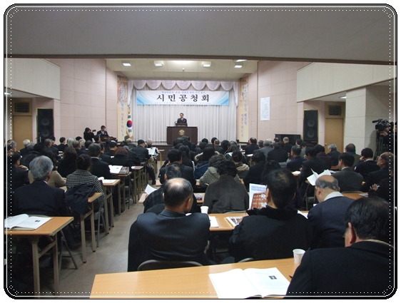2011년 2월 11일 오후 2시부터 서울기독교청년회관(YMCA, 종로2가) 대강당에서 열린 '한글마루지 조성/광화문 현판 다시 걸기 시민 공청회'의 모습. 김형오 전 국회의장의 격려 말씀을 듣고 있는 모인 사람들(위)과 사회를 맡은 한말글문화협회 이대로 대표(아래)의 모습.