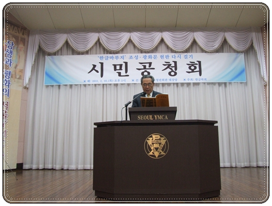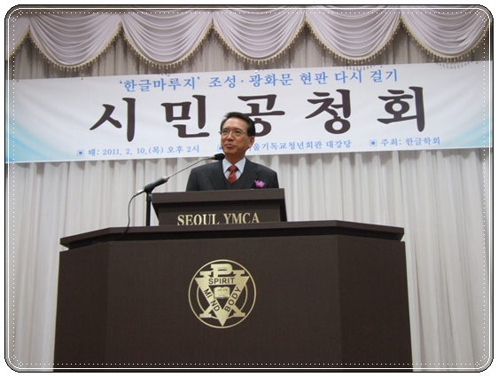 2011년 2월 11일 오후 2시부터 서울기독교청년회관(YMCA, 종로2가) 대강당에서 열린 '한글마루지 조성/광화문 현판 다시 걸기 시민 공청회'의 모습. 한글학회 김종택 회장의 인사말씀(위)과 김형오 전 국회의장의 격려 말씀(아래) 모습.