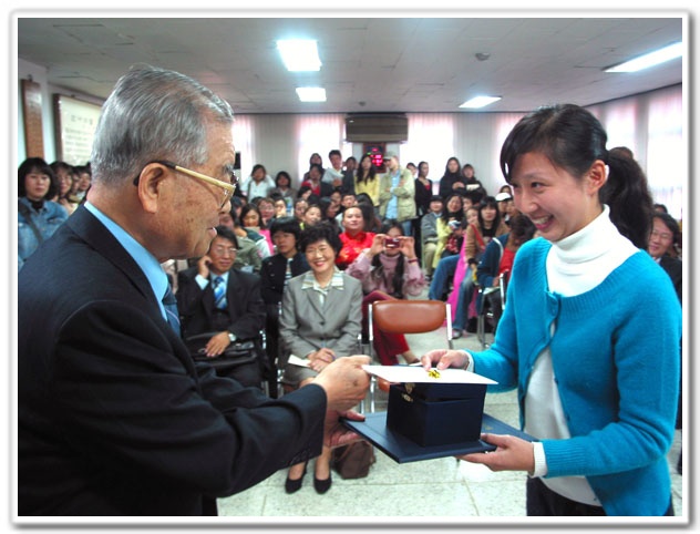 2005년 10월 30일 10시부터 한글회관 5층 강당에서 있었던 제7회 외국인 한국어 발표 대회의 모습입니다. 사진은 으뜸기림을 받고 있는 주손원(중국) 님의 모습입니다. 으뜸기림이 좋긴 좋은 모양입니다. <찍은 이: 김영조(2005. 10. 30.)>