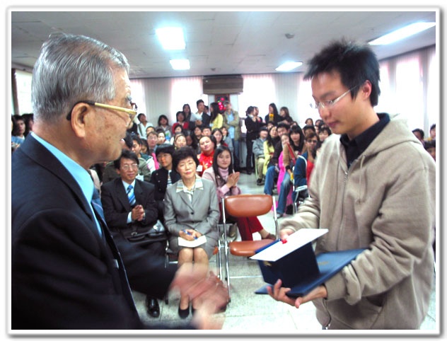 2005년 10월 30일 10시부터 한글회관 5층 강당에서 있었던 제7회 외국인 한국어 발표 대회의 모습입니다. 사진은 추킴기림을 받고 있는 대필뢰(중국) 님의 모습입니다. <찍은 이: 김영조(2005. 10. 30.)>